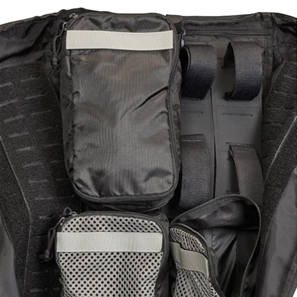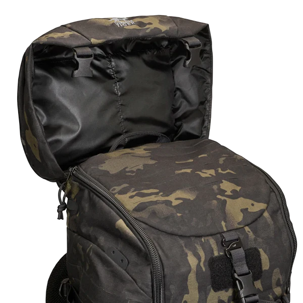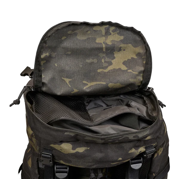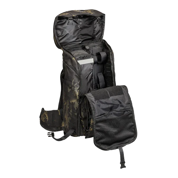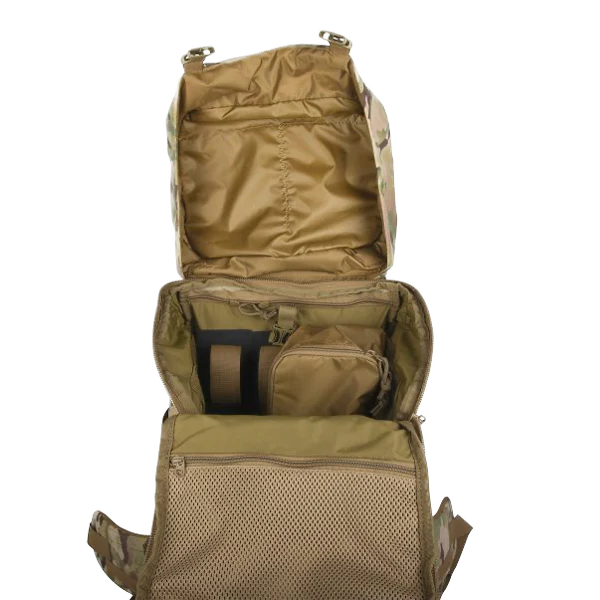 Modular, universal deployment backpack with removable lid. The front opening of this deployment backpack can be fully raised, and the lid can be height-adjusted or removed.